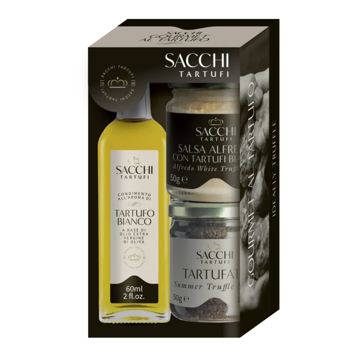 Pakk sisaldab musta trühvli kreemi (klaaspurk 50g), Alfredo kaste(klaaspurk 50g) ja valge trühlvi õli(klaaspudel 60ml).